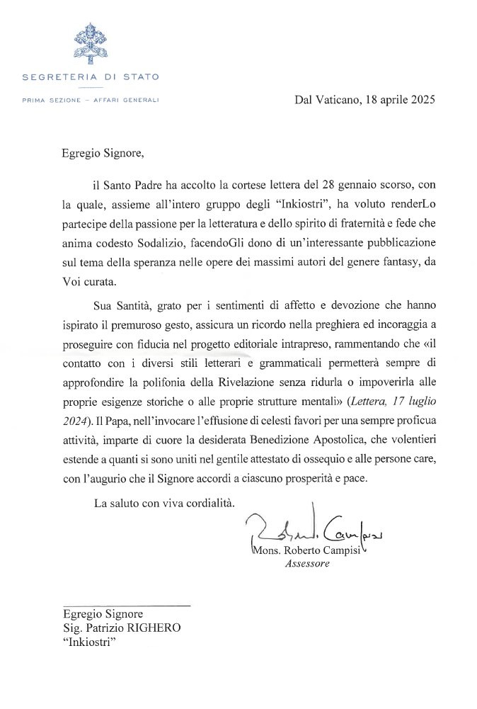 Insomma: la letteratura fantastica (ma si potrebbe dire: la letteratura), quando è grande, intercetta delle esigenze che sono incise nel cuore dell’uomo.