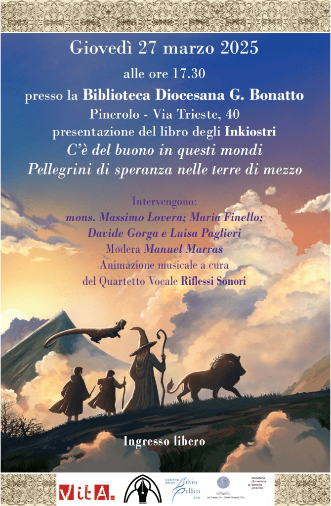 Ma quest’anno si raddoppia! Ci troveremo, proprio nel giorno del TRD, il 27 marzo, a Pinerolo, ore 17.30, presso la Biblioteca Diocesana G. Bonatto, dove parleremo di Tolkien, presenteremo il nostro libro C’è del buono in questi mondi, e pure ascolteremo un po’ di musica.